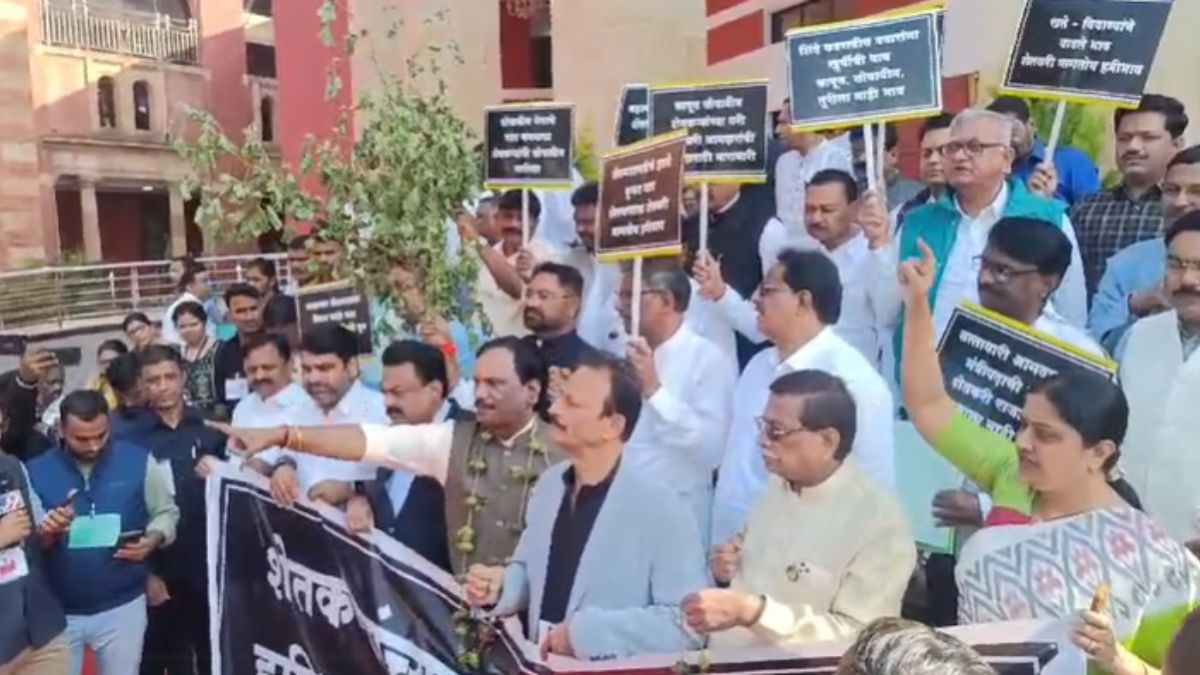 मागणीसाठी महाविकास आघाडीच्या आमदारांचे विधिमंडळाच्या पायऱ्यांवर जोरदार आंदोलन
