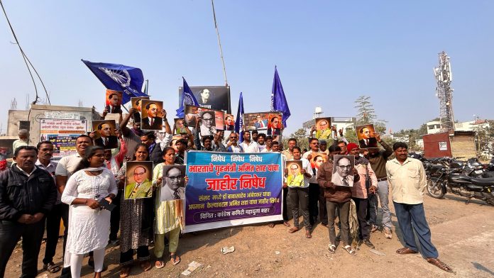 केंद्रीय ग्रृहमंत्री अमित शाह यांनी संविधान निर्माता डॉ. बाबासाहेब आंबेडकर यांच्याबद्दल अपमानजनक वक्तव्य केल्याच्या निषेधार्थ कांग्रेस कमिटी महादूला शहर तर्फे माजी नगरसेवक रत्नदिपभाऊ रंगारी यांच्या नेतृत्वाखाली विश्वरत्न कोराडी — डॉ बाबासाहेब आंबेडकर चौक महादुला येथे आंदोलन करण्यात आले. यावेळी कांग्रेस पक्ष आणि आंबेडकरी जनते तर्फे अमित शाह यांच्या राजीनाम्याची मागणी केली.