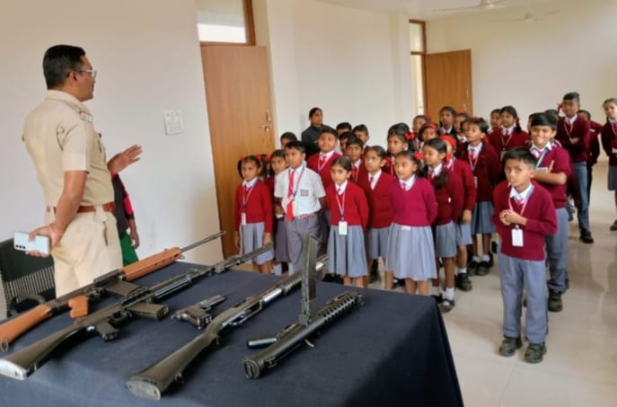सोमवार (दि.६) जानेवारी २०२५ ला पोलीस स्टेशन कन्हान येथे पोलीस रायझिंग डे सप्ताह निमित्त पो. स्टे. कन्हान हद्दीतील बिहारीलाल खंडेलवाल कॉम्प्रेसिव्ह स्कूल कन्हान या शाळेतील विद्यार्थ्यांना पोलीस स्टेशन कन्हान येथे बोलावुन विद्यार्थ्याना पोली स स्टेशनच्या कामकाजाविषयी माहिती देण्यात आली व पोलीस स्टेशन येथील शस्त्र दाखवुन त्यांना शस्त्र विषयी माहिती सांगण्यात आली. तसेच पोलीस हा देशातील शहरी व ग्रामिण भागात शांती सुव्यवस्था कायम ठेवण्याकरिता मौलिक कार्याचा आधारस्तंभ आहे. त्याबाबत माहिती देण्यात आली. याप्रसंगी ठाणे दार कन्हान पोलिस निरीक्षक राजेंद्र पाटील साहेब, पोलिस नाईक आतिश मानवटकर, हे.कॉ.नरेश श्रावण कर, महिला पोलिस हवालदार नालंदा पाटील, वीणा थुल, बीकेसीपी शाळे तील शिक्षिका सौ अरुणा शर्मा, रेणु राऊत सह विद्यार्थी प्रामनख्याने उपस्थित होते.