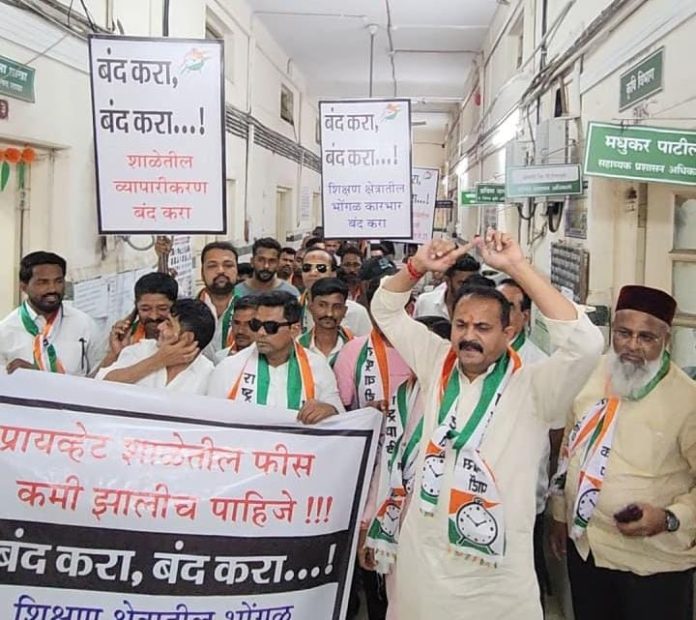 दरवर्षी वाढणारी फी व शाळेच्या वतीने पालकांना बळजबरीने पुस्तके आणि ड्रेस खरेदी विरोधात राष्ट्रवादी युवक काँग्रेसचे आंदोलन