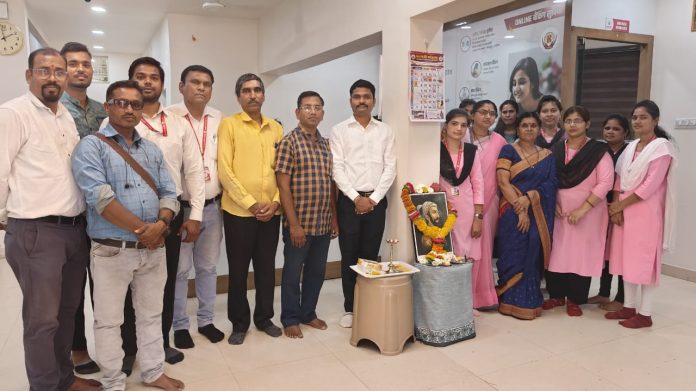 कामठी -महाराष्ट्राचे आराध्य दैवत छत्रपती शिवाजी महाराज यांची तिथीनुसार शिवजयंती युवा चेतना मंच व कामठी महीला अर्बन क्रेडिट को ऑपरेटिव्ह सोसायटी लिमिटेड यांच्या संयुक्त विद्यमाने कामठी महीला अर्बन क्रेडिट को ऑपरेटिव्ह सोसायटी लिमिटेड बैंक येथे बैंकेचे संचालक नितीन जी ठाकरे, पालक संचालक नरेश जी सोरते , दिव्यांग फाऊंडेशनचे सचिव बाॅबी महेंद्र, जेष्ठ नागरिक कुमुद सगदेव यांच्या प्रमुख उपस्थितीत साजरी करण्यात आली. याप्रसंगी सामुहिक पुजन व शिव स्तुती घेण्यात आली. याप्रसंगी सुत्रसंचलन प्रा पराग सपाटे व आभार प्रदर्शन हिमांशू लोंडेकर यांनी केले.याप्रसंगी भाग्यश्री पटले, योगेश्वरी तडसे , मोनिका गंगापारी , हर्षलता पाटील, धनश्री तुपकर , विशाखा भिमटे , अभिलाष बंड, सुर्यकांत पौनीकर , सुरेंद्र भक्ता उपस्थित हो |